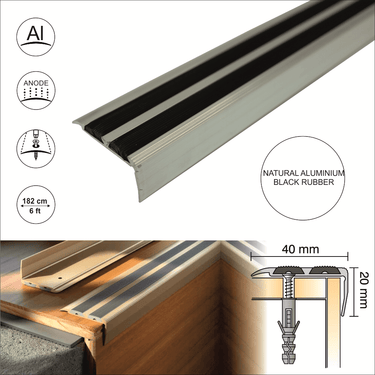 SA11 40x20mm Heavy Duty Non-Slip Aluminium Stair Nosing Trim with Rubber Insert – External Use
