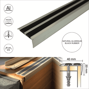 SA11 40x20mm Heavy Duty Non-Slip Aluminium Stair Nosing Trim with Rubber Insert – External Use